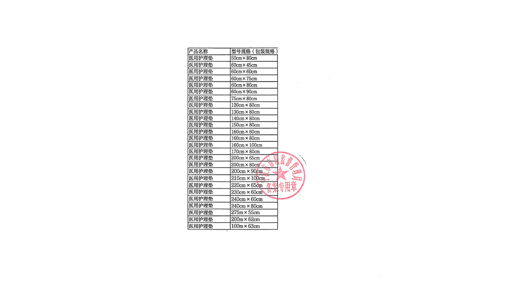 [規(guī)格尺寸] 醫(yī)用護理墊的基本規(guī)格尺寸為50cm×80cm、60cm×45cm、60cm×60cm、60cm×75cm、60cm×80cm、60cm×90cm、75cm×80cm、120cm×80cm、130cm×80cm、140cm×80cm、150cm×80cm、160cm×60cm、160cm×80cm、160cm×100cm、170cm×80cm、200cm×65cm、200cm×80cm、200cm×90cm、210cm×100cm、220cm×65cm、230cm×60cm、240cm×60cm、240cm×80cm,275m×55cm、200m×62cm、100m×63cm規(guī)格允差為±8%。